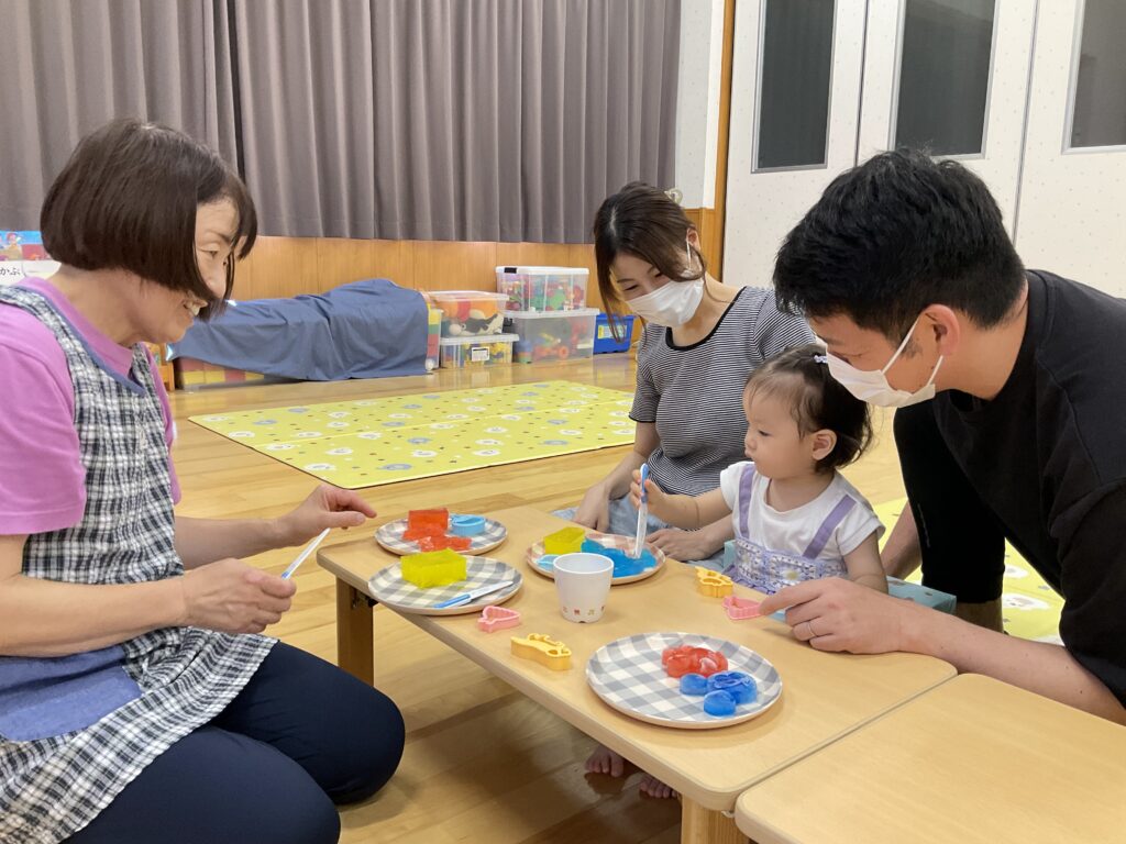 ままごとの包丁を使い、ゼリーを切る感触を楽しみながら集中して遊んでいましたよ♪